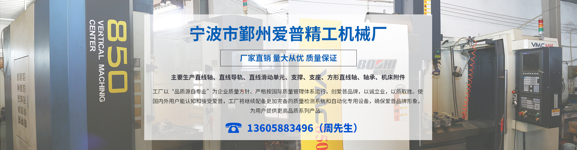 宁波市鄞州爱普精工机械厂座落于中国综合竞争力第八的港口城市——宁波市,是一家专业研发加工制造,自动化设备所必须的,以直线运动系列产品为主的各种配件,包括直线轴、直线导轨、直线滑动单元、支撑、支座、方形直线轴、轴承、机床附件等产品。